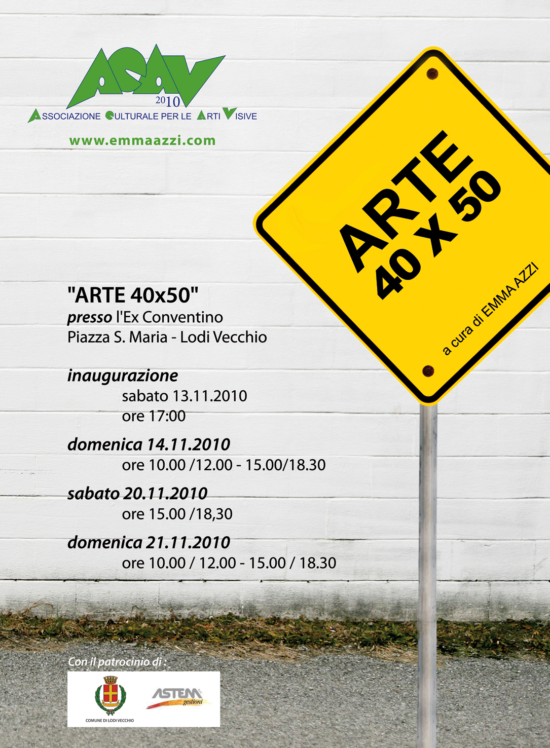 Arte 40x50 mostra a cura di Emma Azzi al Conventino - Piazza S. Maria Inaugurazione sabato 13 novembre alle ore 17,00 domenica 14 - 10,00/ 12,00 -15,00/ 18,30 sabato 20 - 15,00 / 18,30 domenica 21 - 10,00 / 12,00 15,00 /18,30 |
