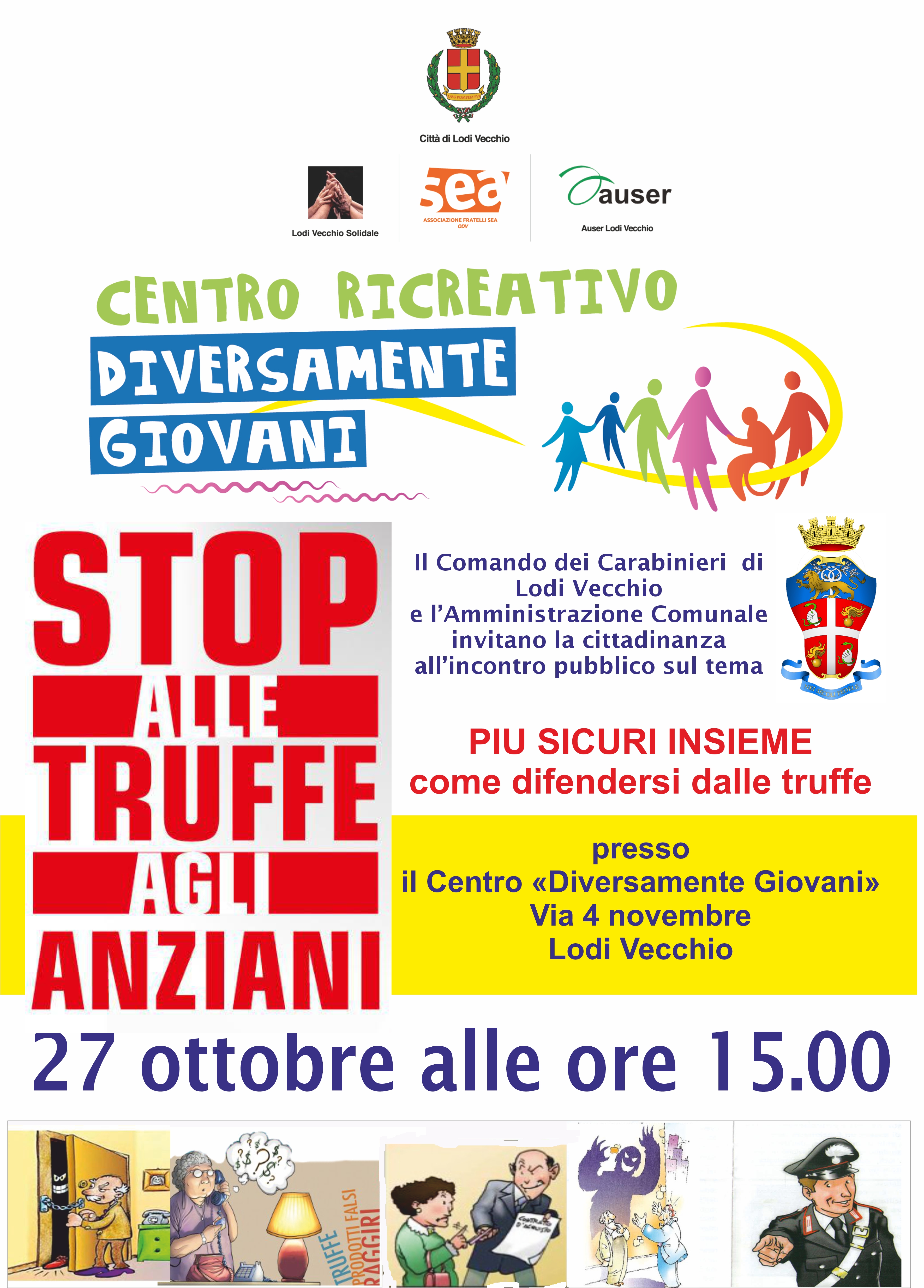 IN collaborazione con il Comando dei Carabinieri di Lodi Vecchio , presso il Centro diversamente giovani alle ore 15,00 - incontro pubblico sul tema: pił sicuri insieme, come difendersi dalle truffe