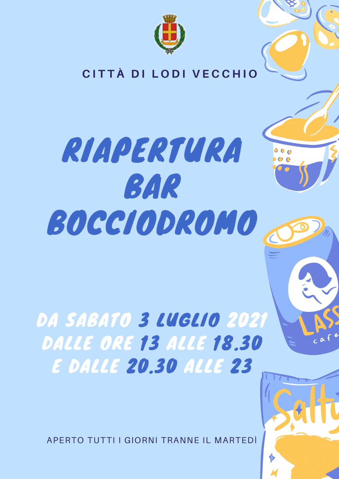 Da sabato 3 luglio 2021 dalle ore 13,00 alle ore 18,30 e dalle 20,30 alle 23,00- Aperto tutti i giorni tranne il martedì