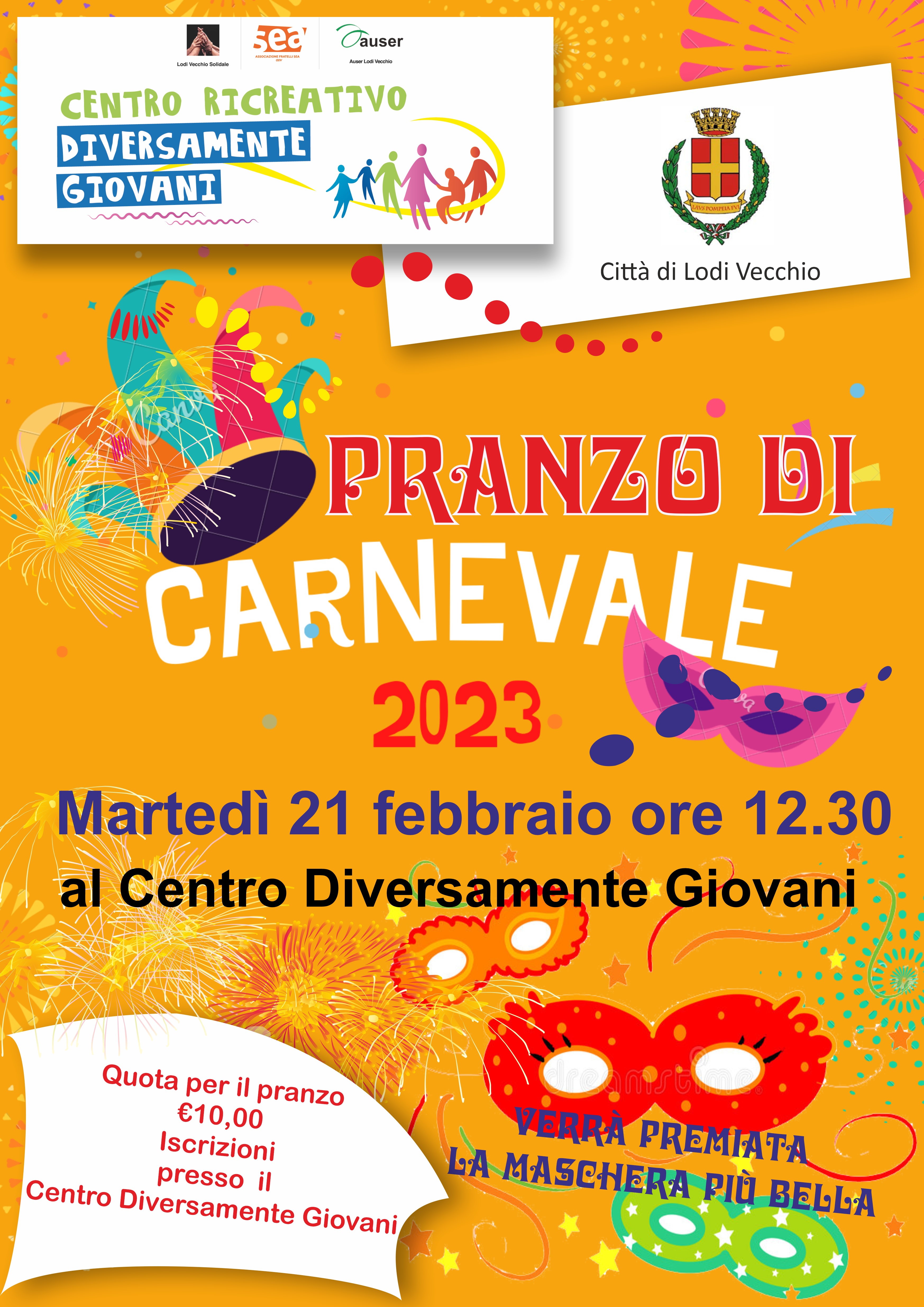 Al Centro Diversamente Giovani pranzo di Carnevale 21 febbraio 2023 ore 12,30 Per prenotazioni rivolgersi al Centro .