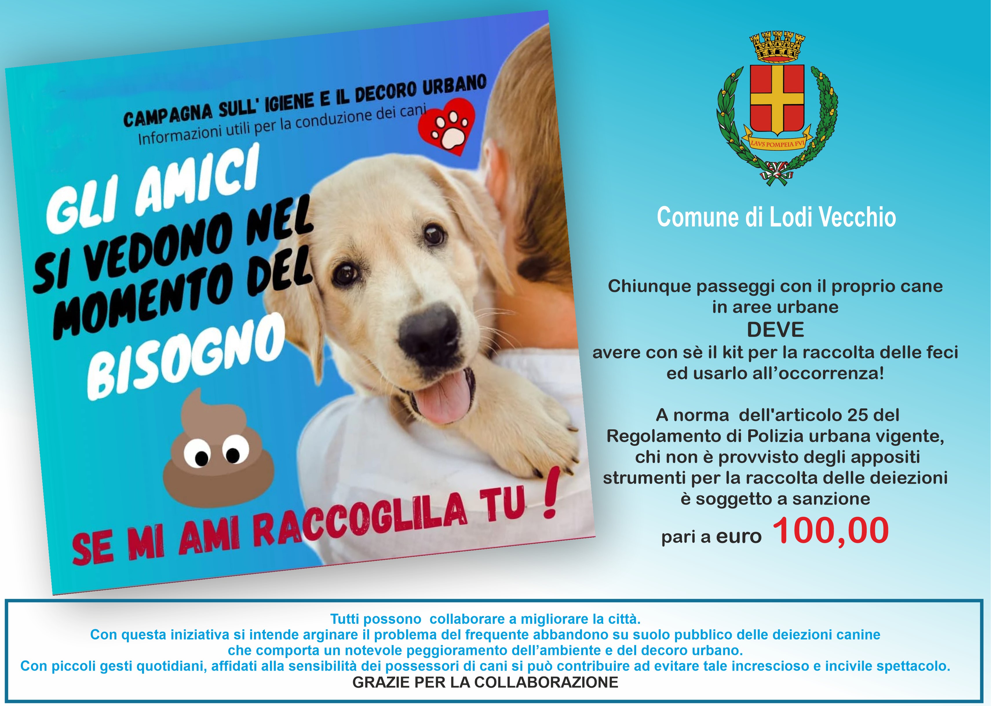 Con questa iniziativa si intende arginare il problema del frequente abbandono su suolo pubblico delle deiezioni canine che comporta un notevole peggioramento dell’ambiente e del decoro urbano. Con piccoli gesti quotidiani, affidati alla sensibilitą dei possessori di cani si puņ contribuire ad evitare tale increscioso e incivile spettacolo.