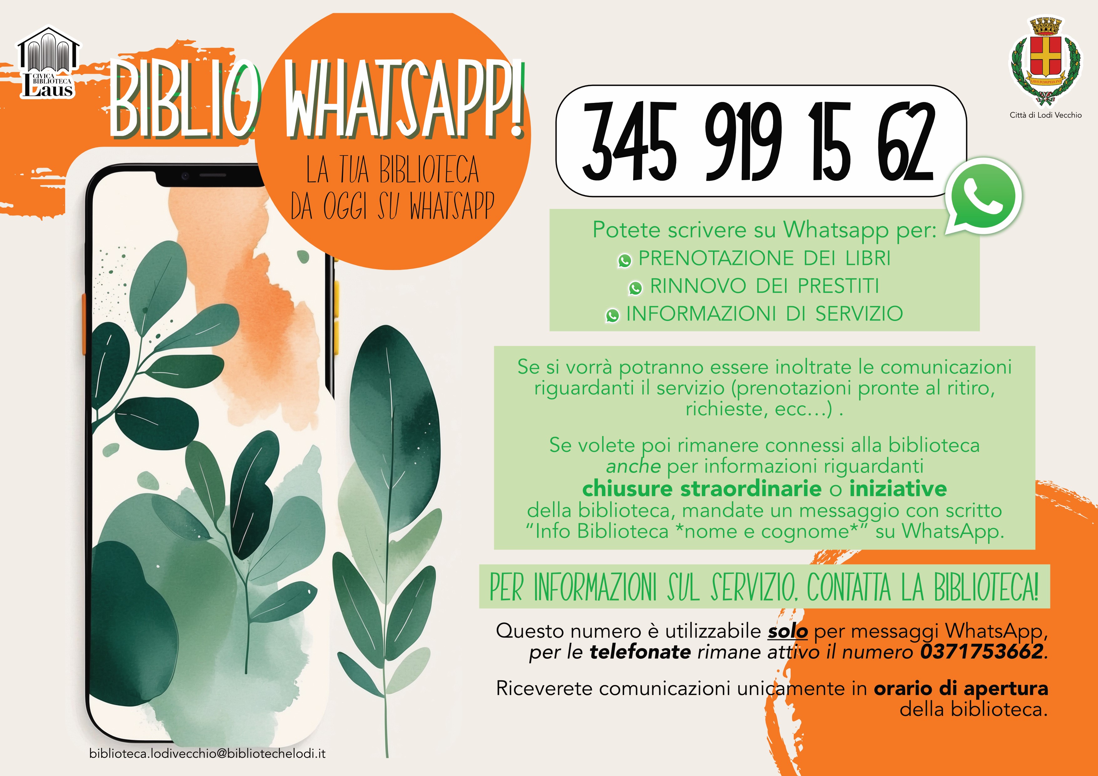 biblio whatsapp : 345 919 15 62 a questo numero : PRENOTAZIONE DEI LIBRI RINNOVO DEI PRESTITI INFORMAZIONI DI SERVIZIO