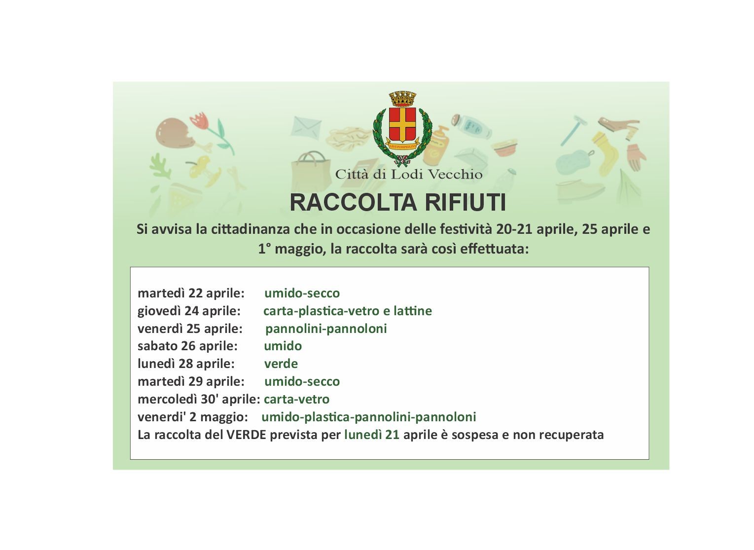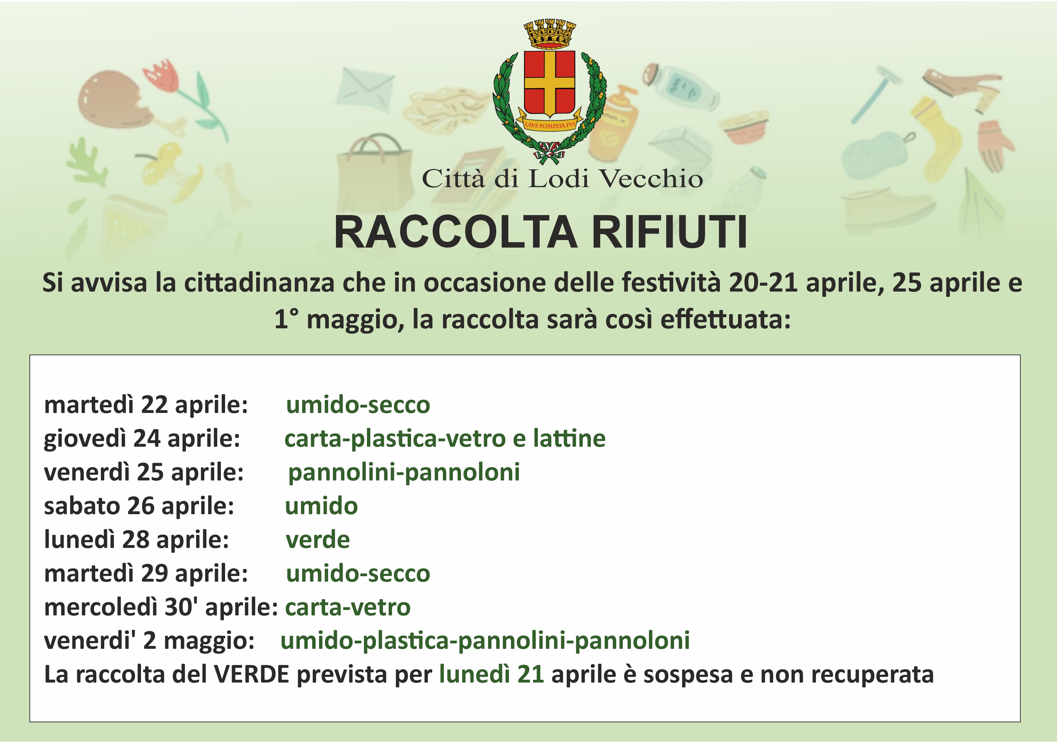 🗑️ In occasione delle festività del 20-21 aprile, 25 aprile e 1° maggio, la raccolta rifiuti subirà delle modifiche.